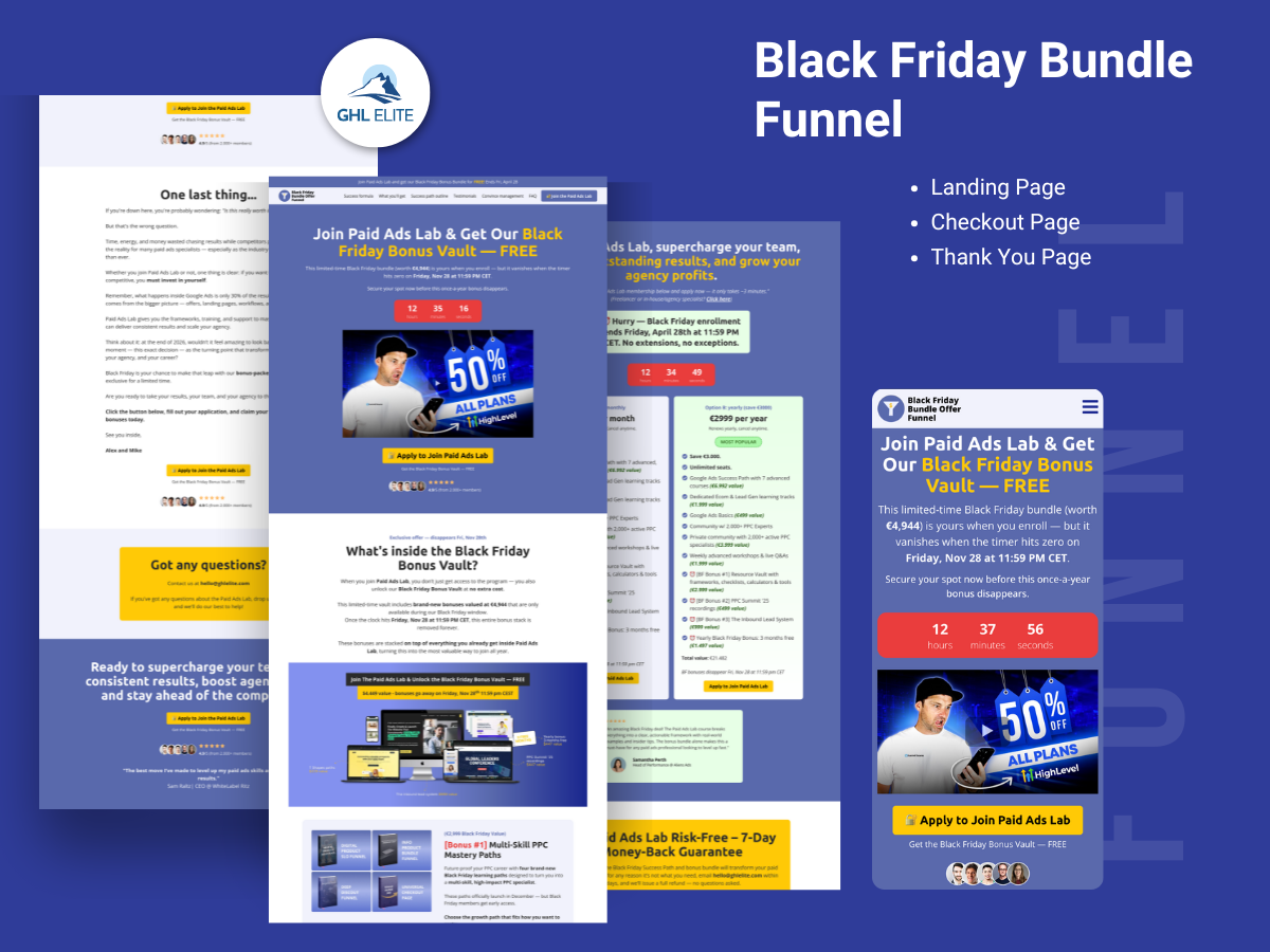 The Black Friday Bundle Funnel is a GoHighLevel template designed for agencies, consultants, and performance marketers who want to convert seasonal traffic into high-intent buyers. It combines urgency-driven messaging, clear value stacking, and a streamlined checkout flow. Perfect for limited-time Black Friday and Cyber Monday offers.