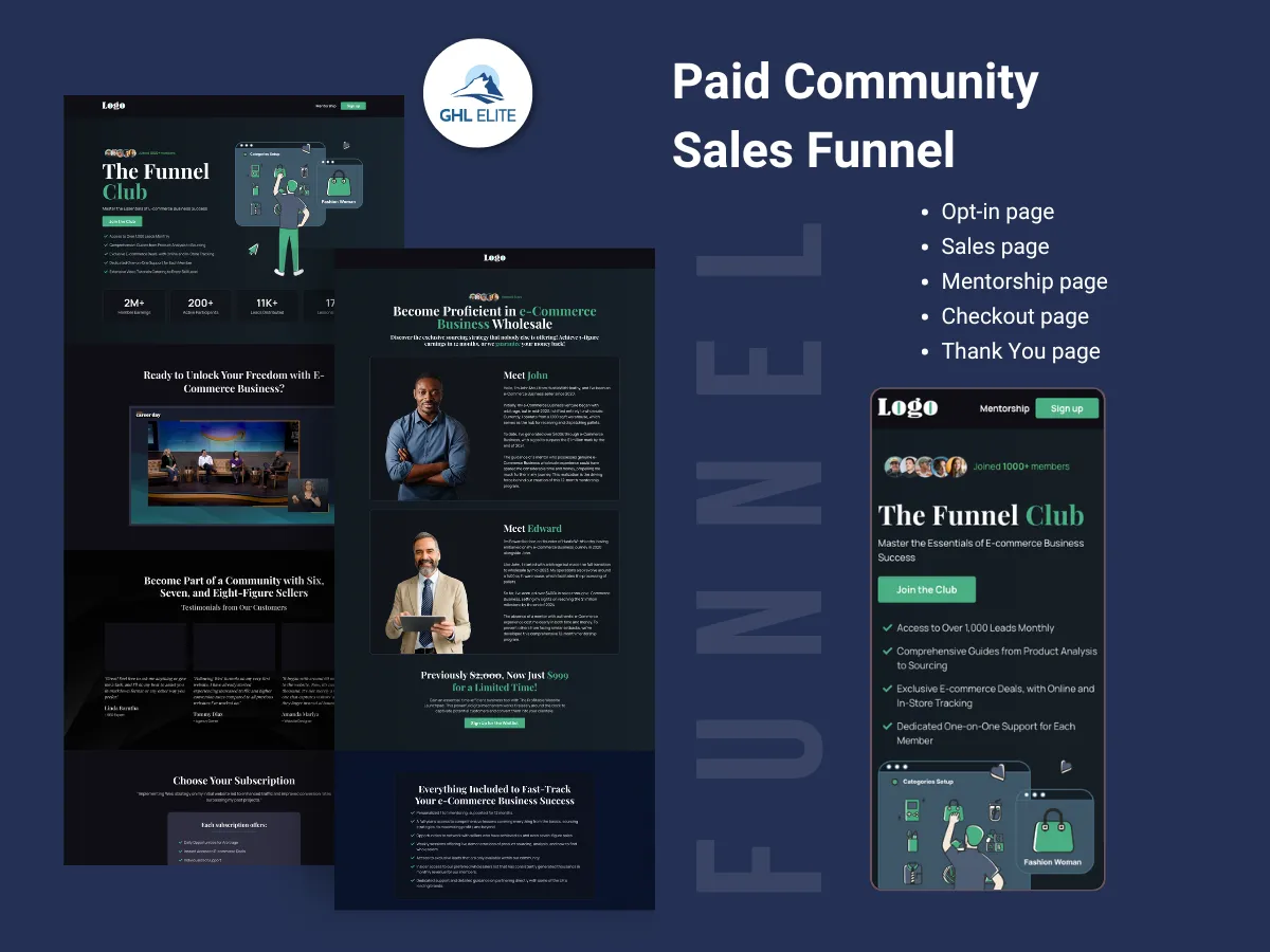 Our Paid Community Sales Funnel is an ideal sales funnel for any type of community, whether it’s a community of prospects, customers, partners, employees, investors, and more for high-conversion. This High Level funnel includes 5 pages, Opt-in, Sales, Mentorship, Checkout and a Thank you page.. Easy to use and expertly crafted, this template simplifies the process of growing your community. Upgrade your community experience today with our Paid Community Sales Funnel template.